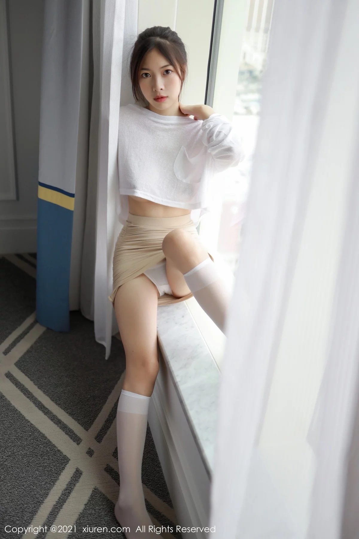 [XiuRen秀人网]No.3792 模特明日花桃桃澳门旅拍薄透动人白T配短裙秀翘臀美腿诱惑写真45P