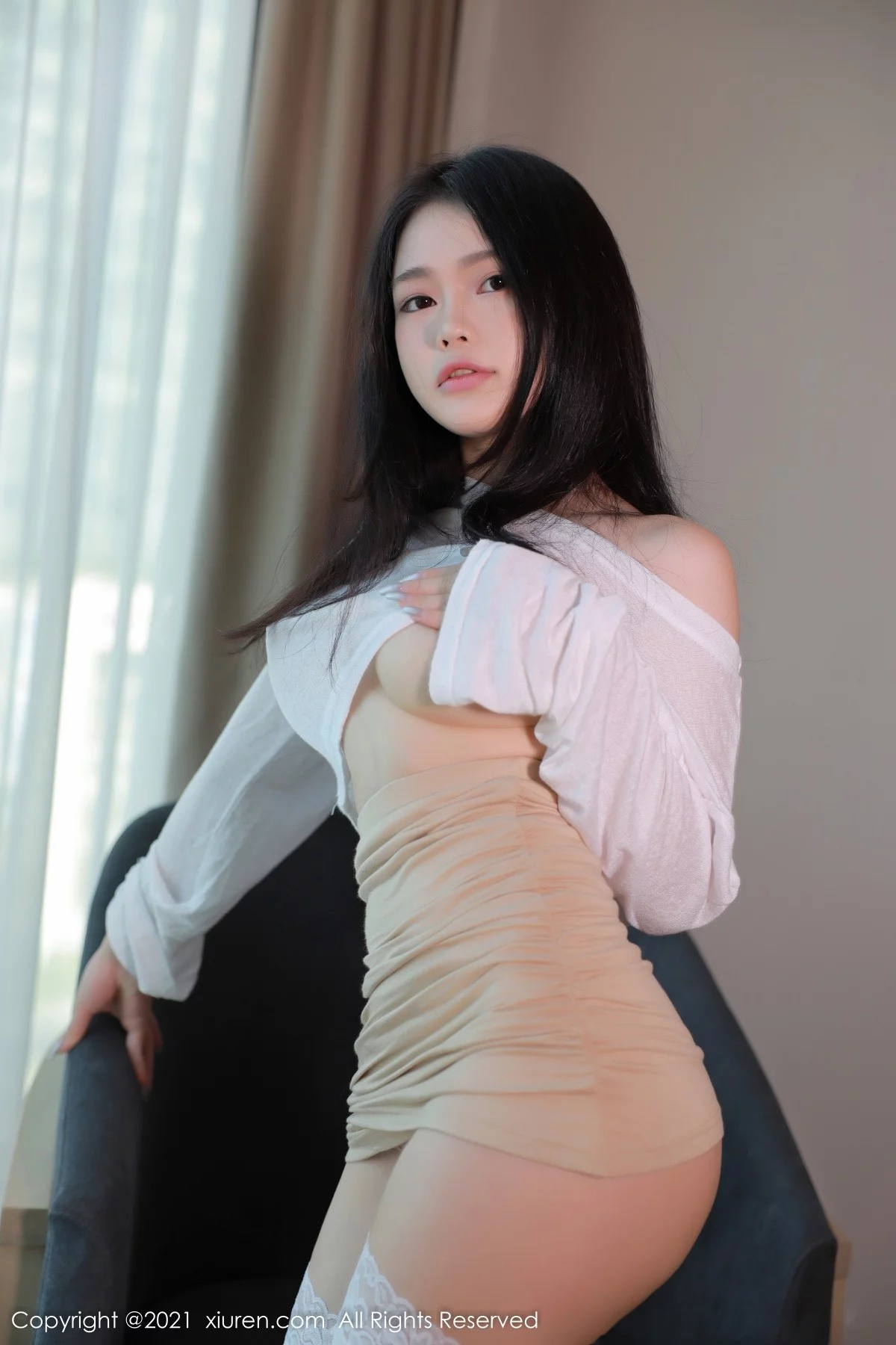 [XiuRen秀人网]No.4305 模特Niki可雅白色薄透服饰配超短裙蕾丝袜秀翘臀美腿诱惑写真53P