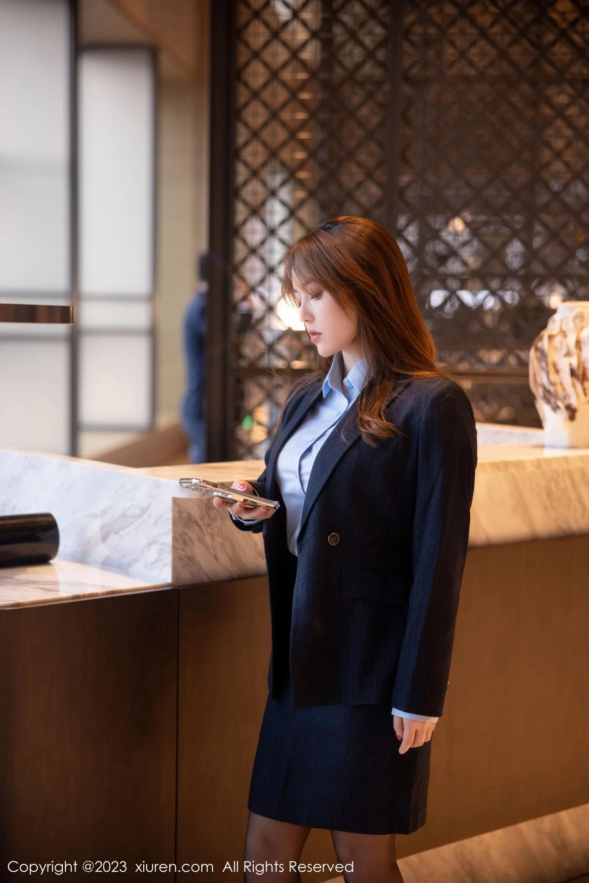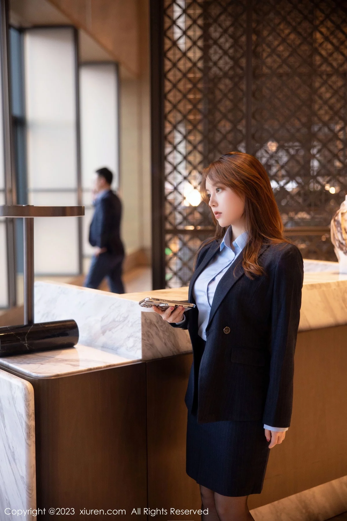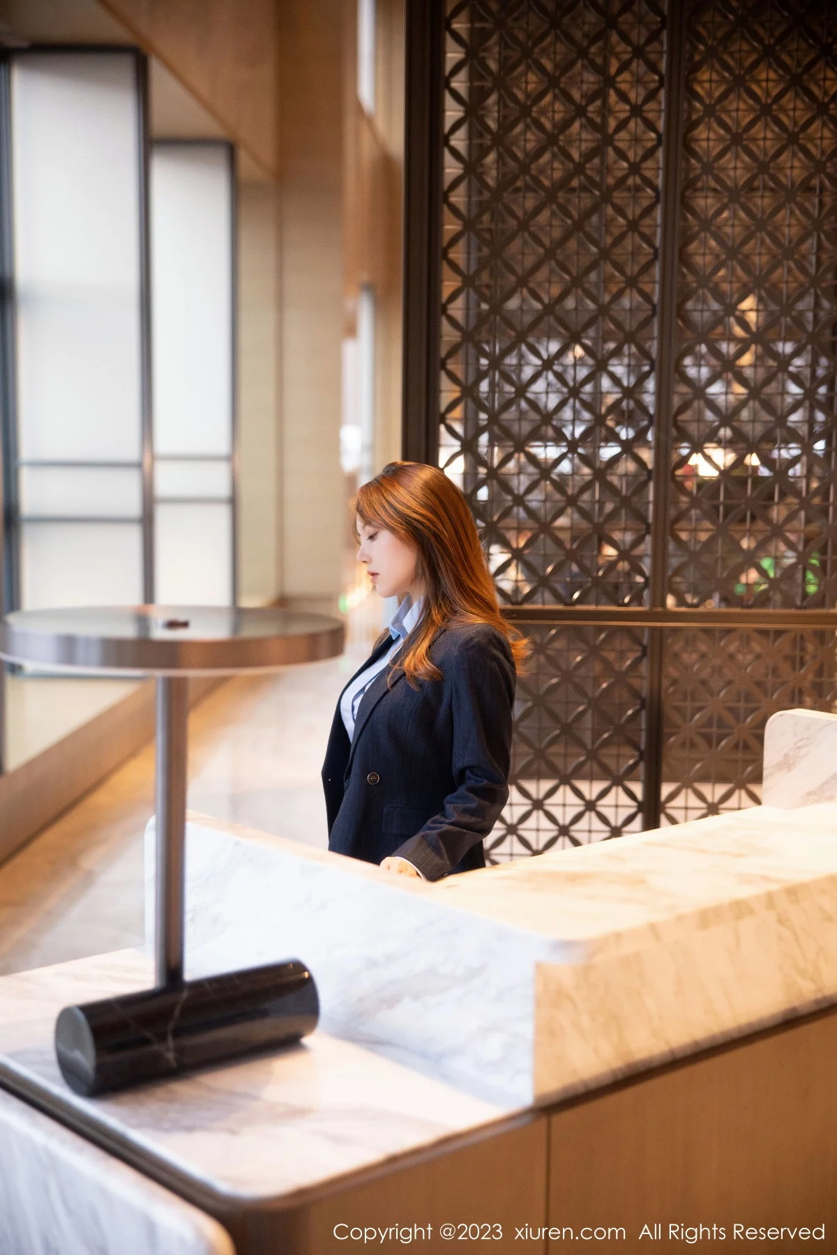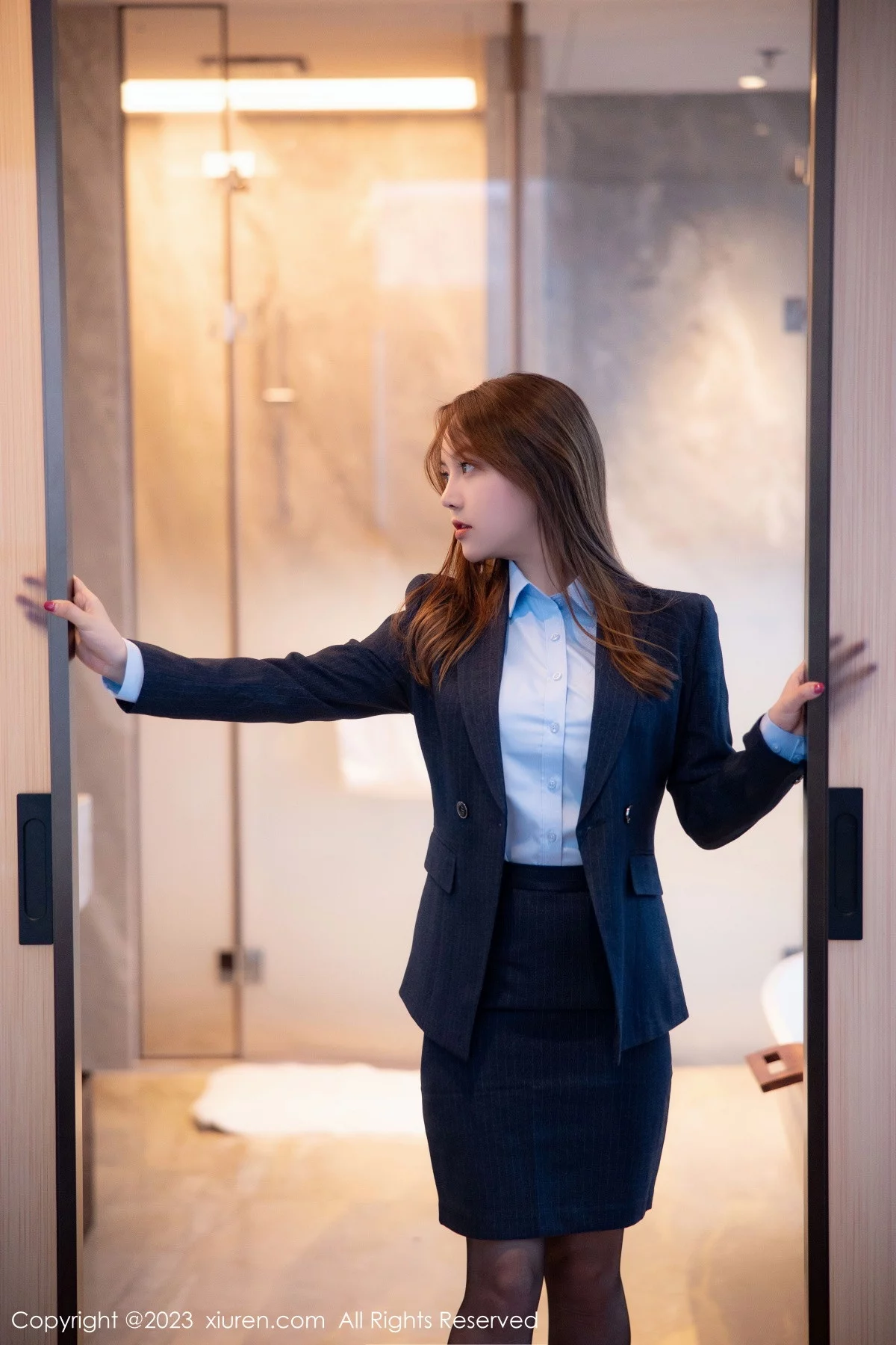 [XiuRen秀人网]No.6190 模特豆瓣酱OL装扮深蓝色西服半脱露粉色蕾丝内衣丰满诱惑写真78P