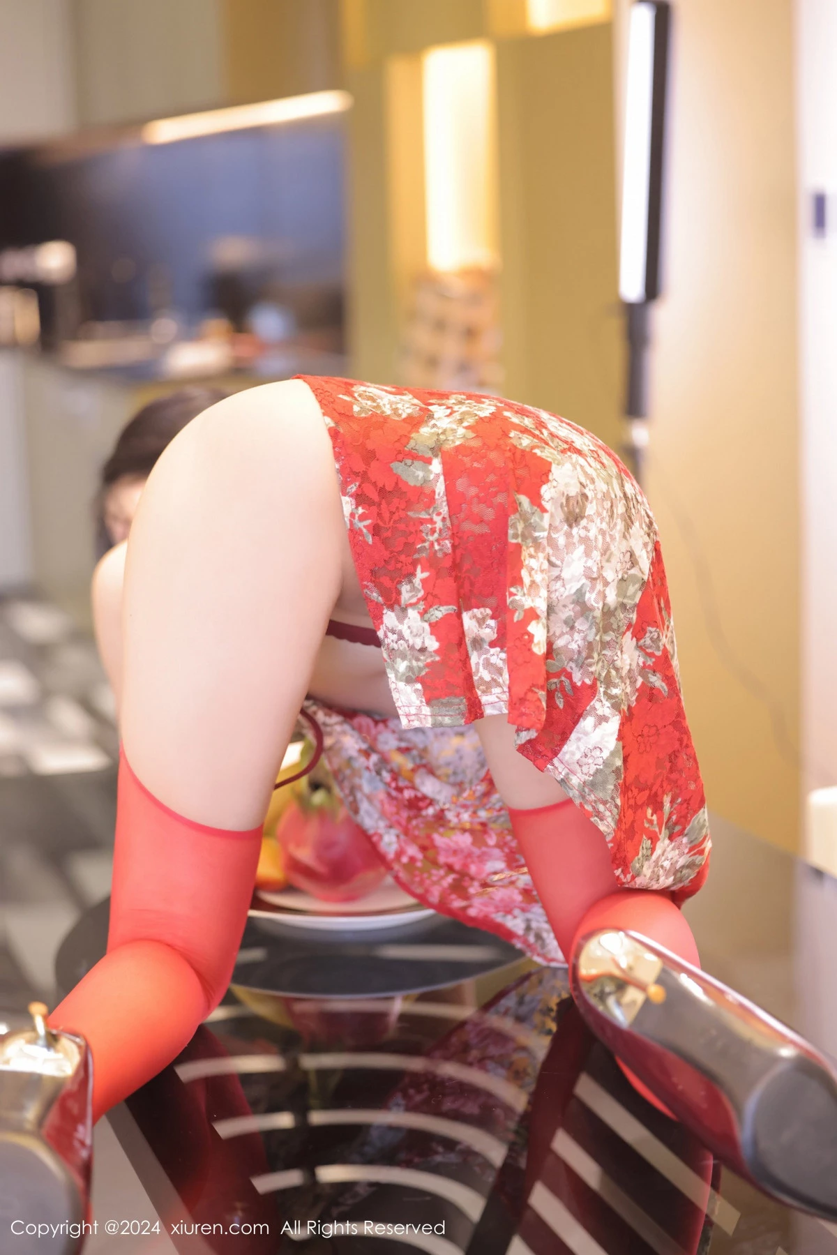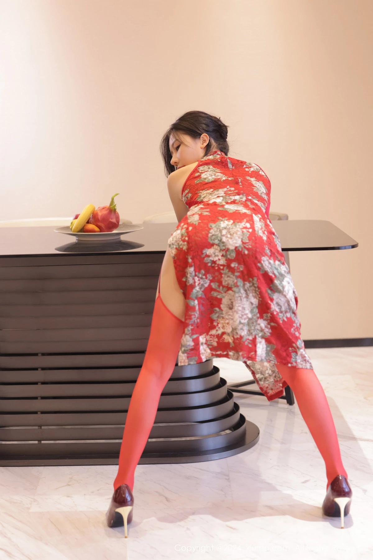 [XiuRen秀人网]No.8871 模特尹甜甜性感红色旗袍服饰配红丝吊袜半撩秀翘臀美腿诱惑写真92P