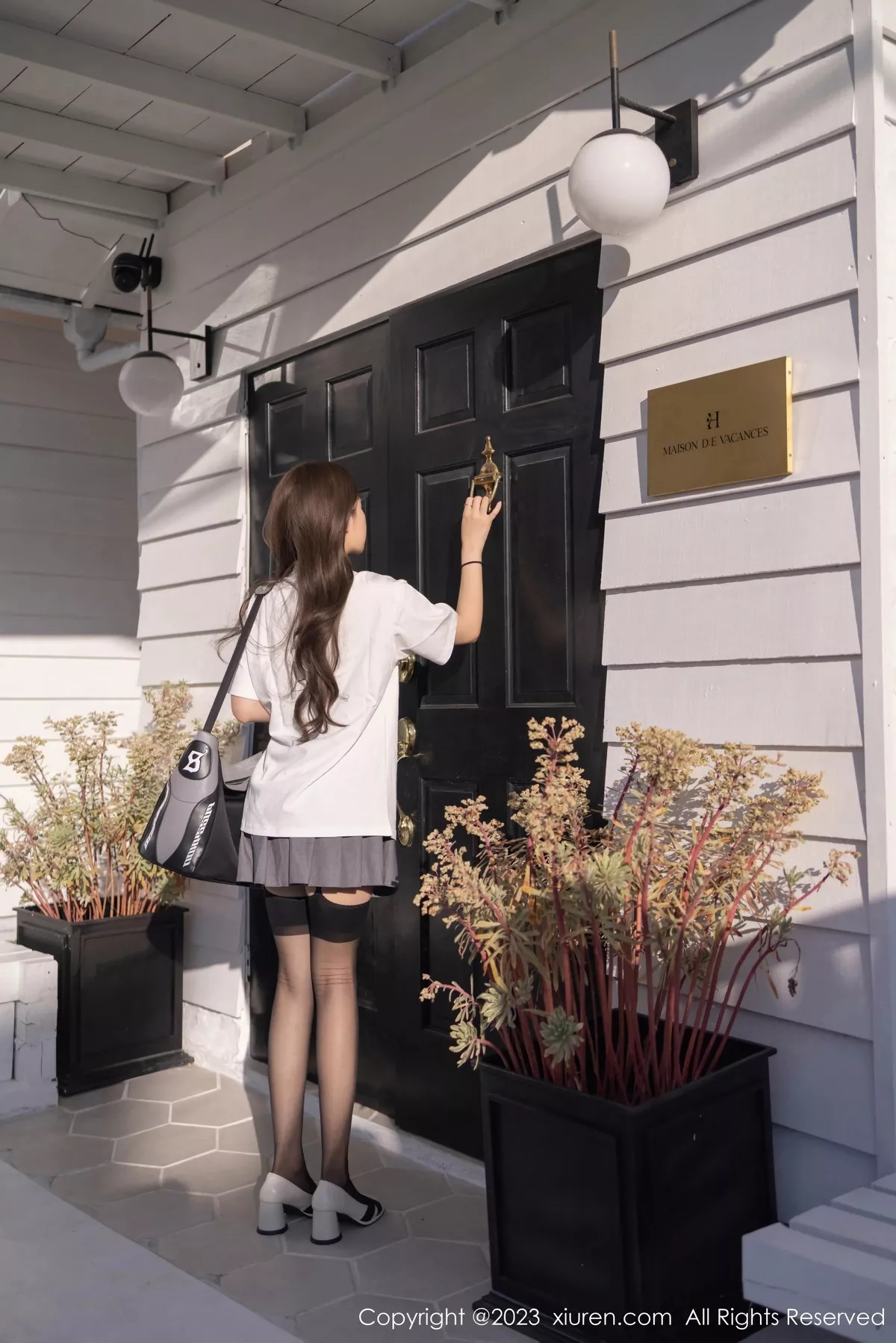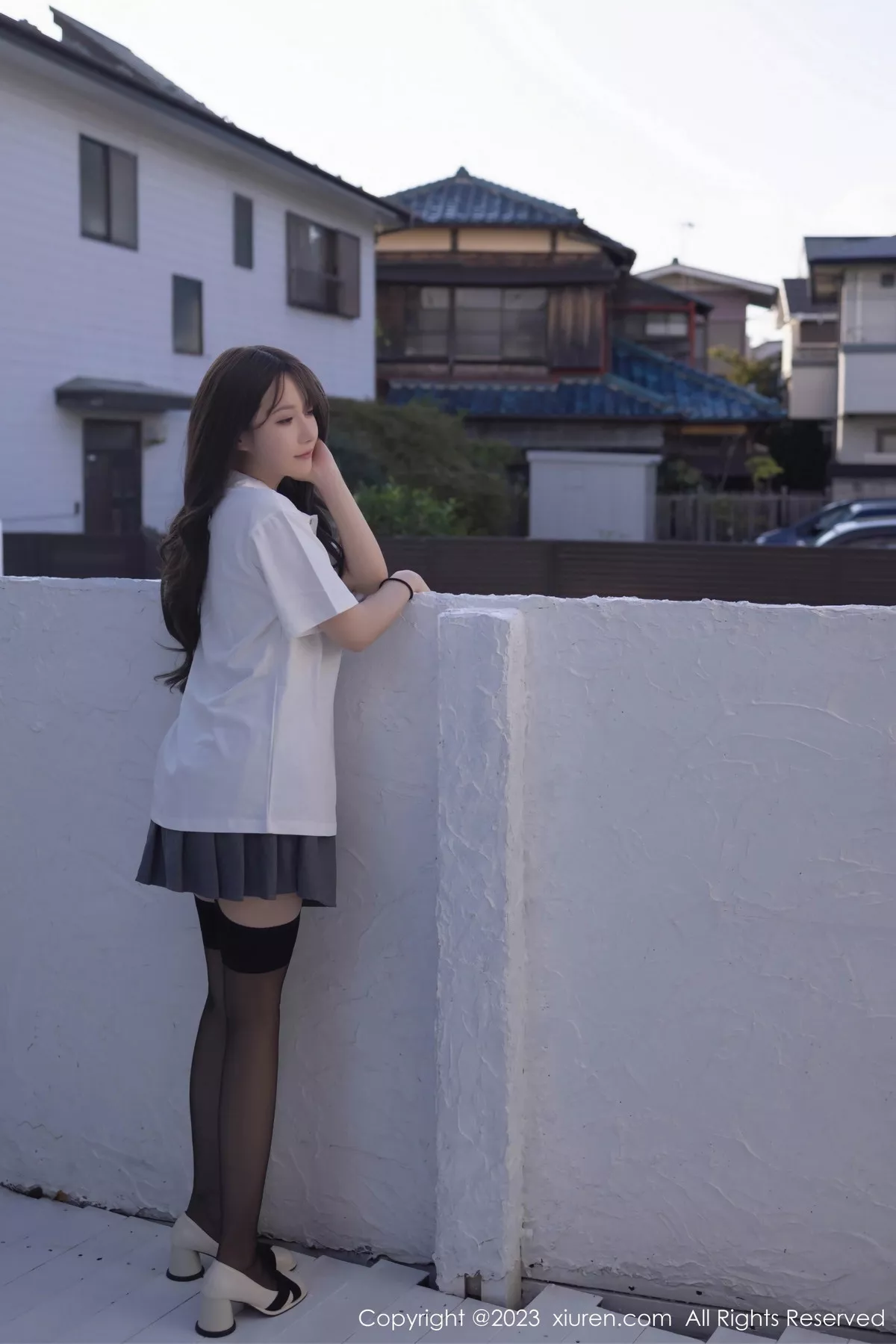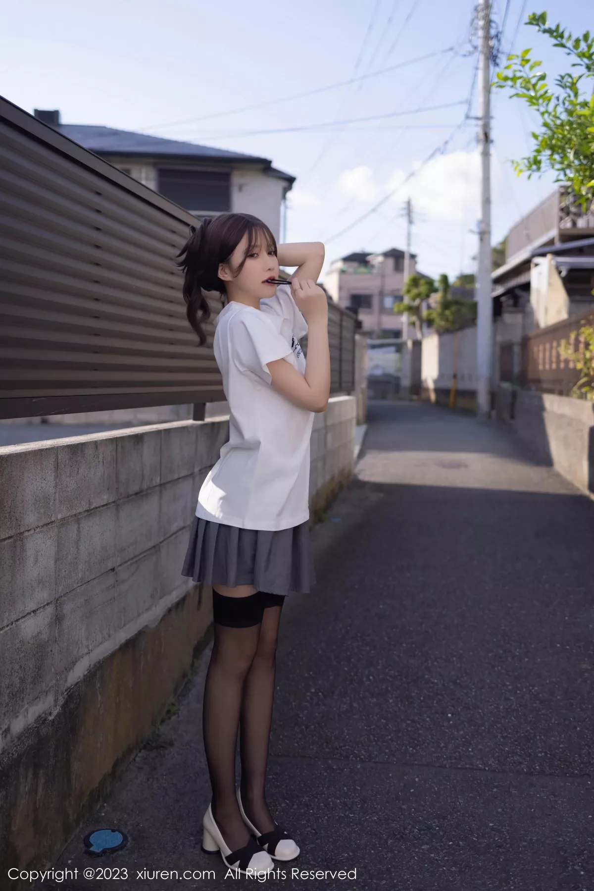 [XiuRen秀人网]No.7475 模特鱼子酱Fish性感白T配灰短裙露黑丝吊袜秀曼妙身姿诱惑写真85P