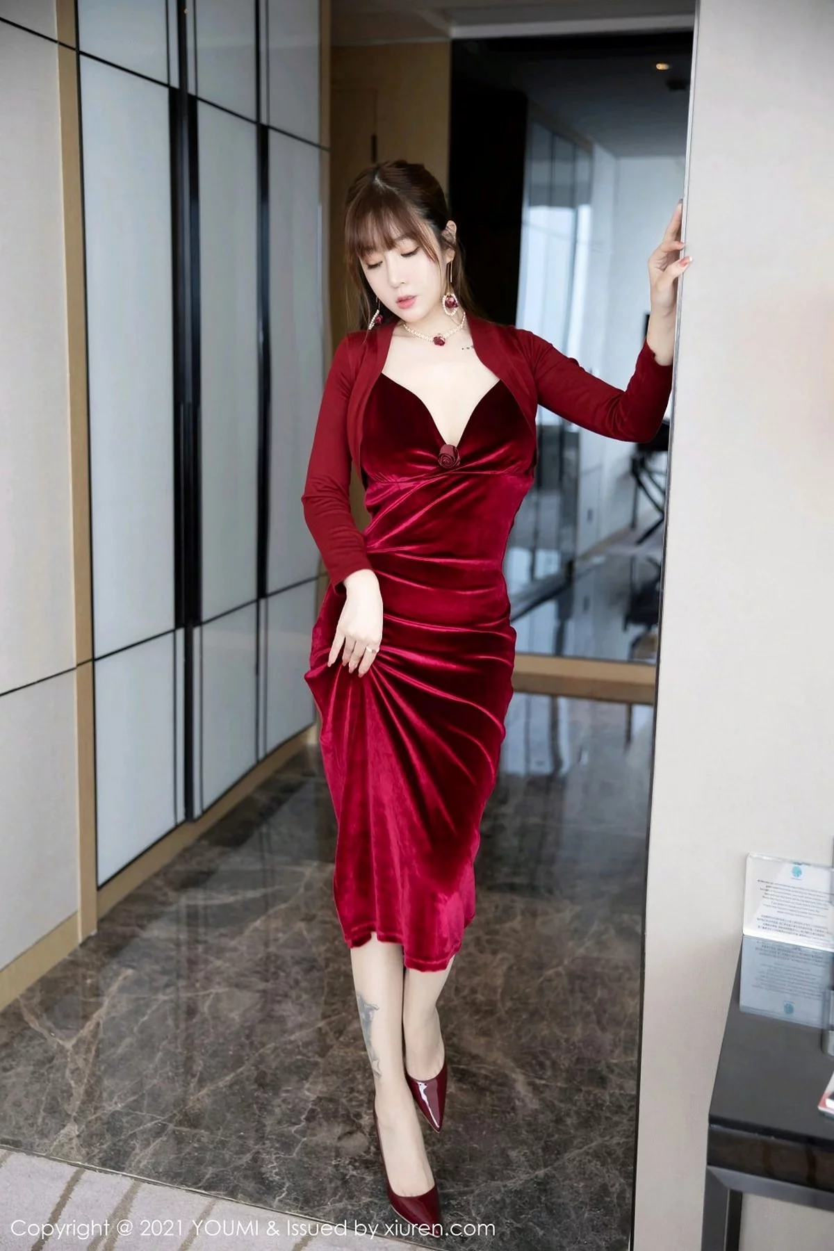 [YouMi尤蜜荟]Vol.588 女神王雨纯典雅酒红色礼裙半撩露肉丝裤袜秀翘臀美腿诱惑写真49P