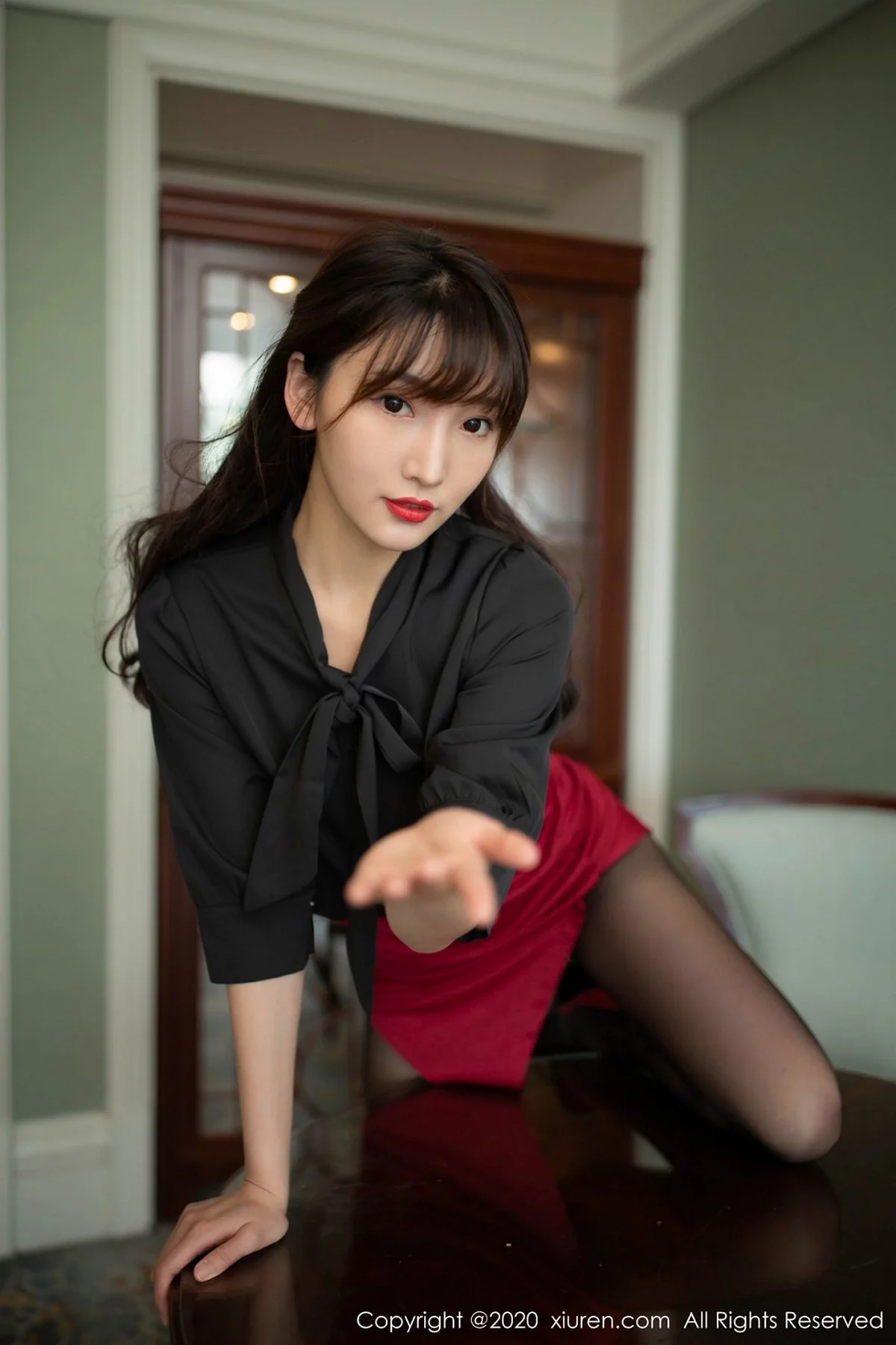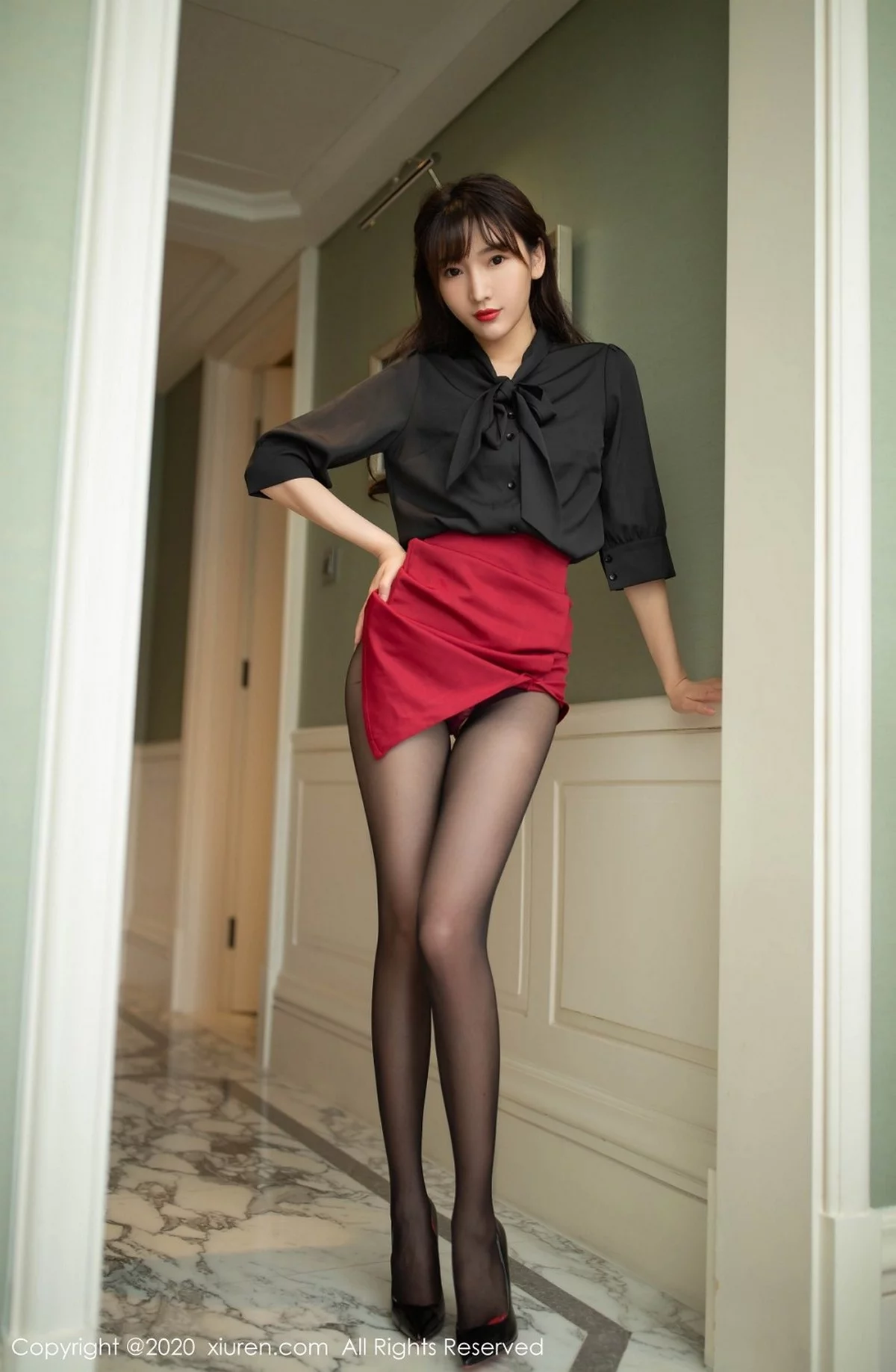 [XiuRen秀人网]No.2498 嫩模陆萱萱乌镇+太湖旅拍制服OL主题红色内衣配黑丝裤袜诱惑写真82P