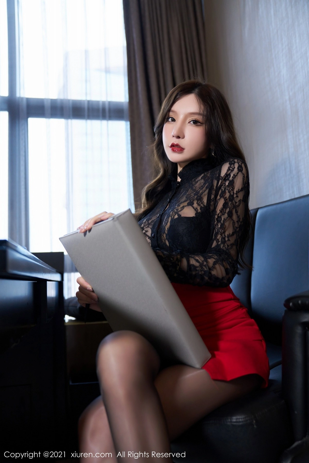 [XiuRen秀人网]No.3595 女神芝芝Booty私房半脱露红色内衣配无内黑丝裤袜娇媚动人写真70P