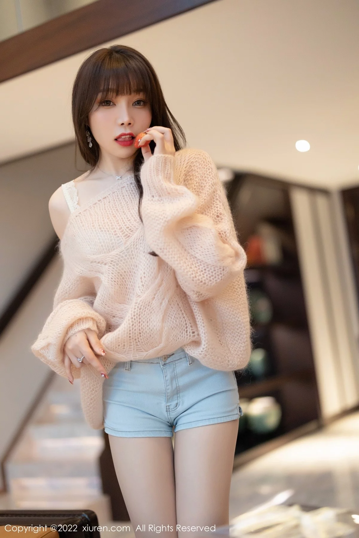 [XiuRen秀人网]No.4435 女神芝芝Booty私房缕空毛衣配牛仔短裤半脱露性感内衣诱惑写真94P