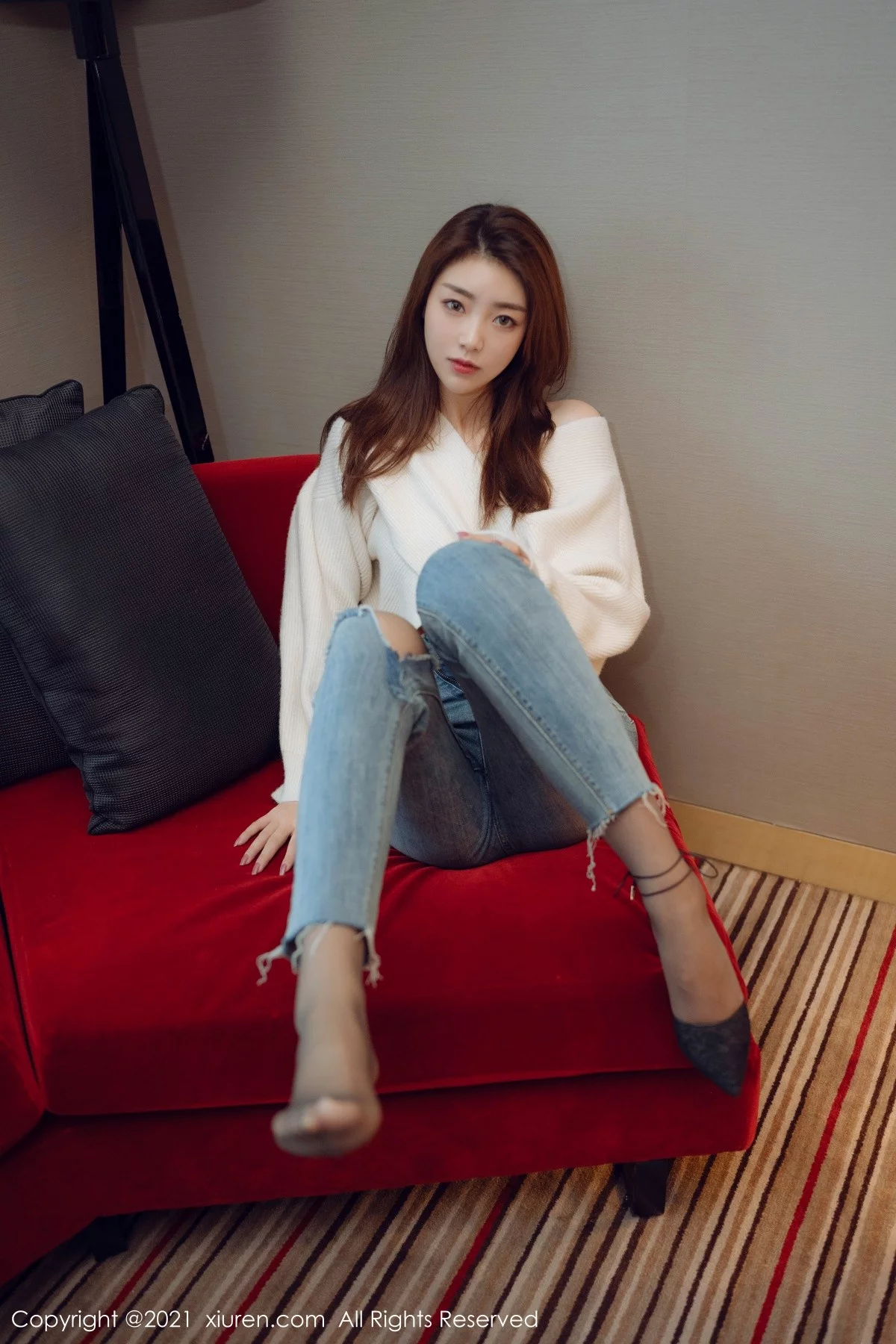 [XiuRen秀人网]No.3493 嫩模可乐Vicky私房脱紧身牛仔裤露超薄黑丝裤袜诱惑写真33P