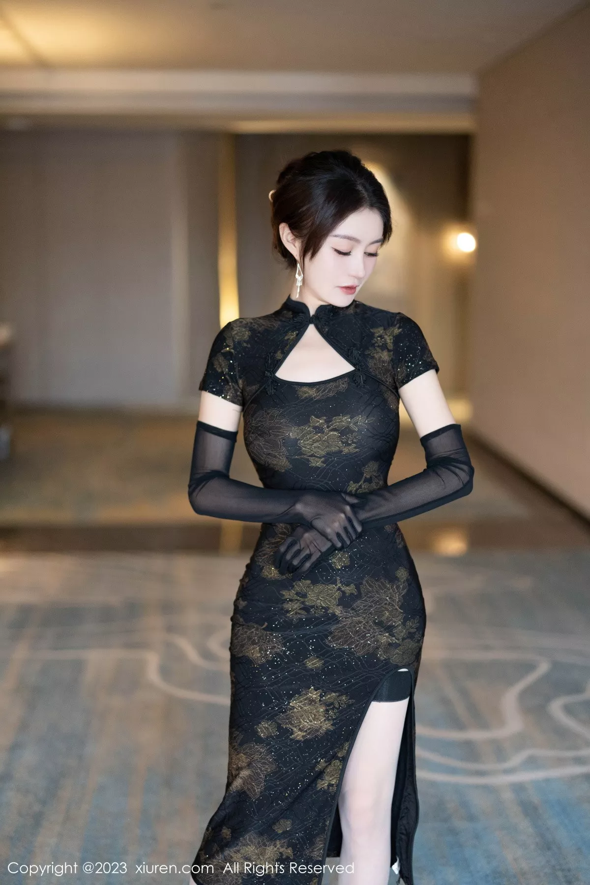 [XiuRen秀人网]No.7688 模特唐宁宁性感黑色情趣旗袍服饰配黑丝袜秀丰腴身姿诱惑写真81P