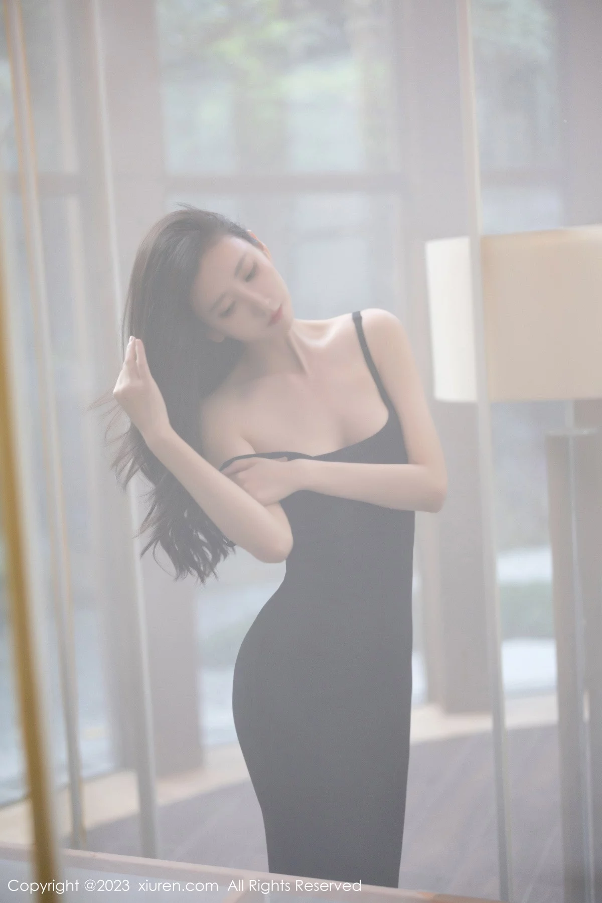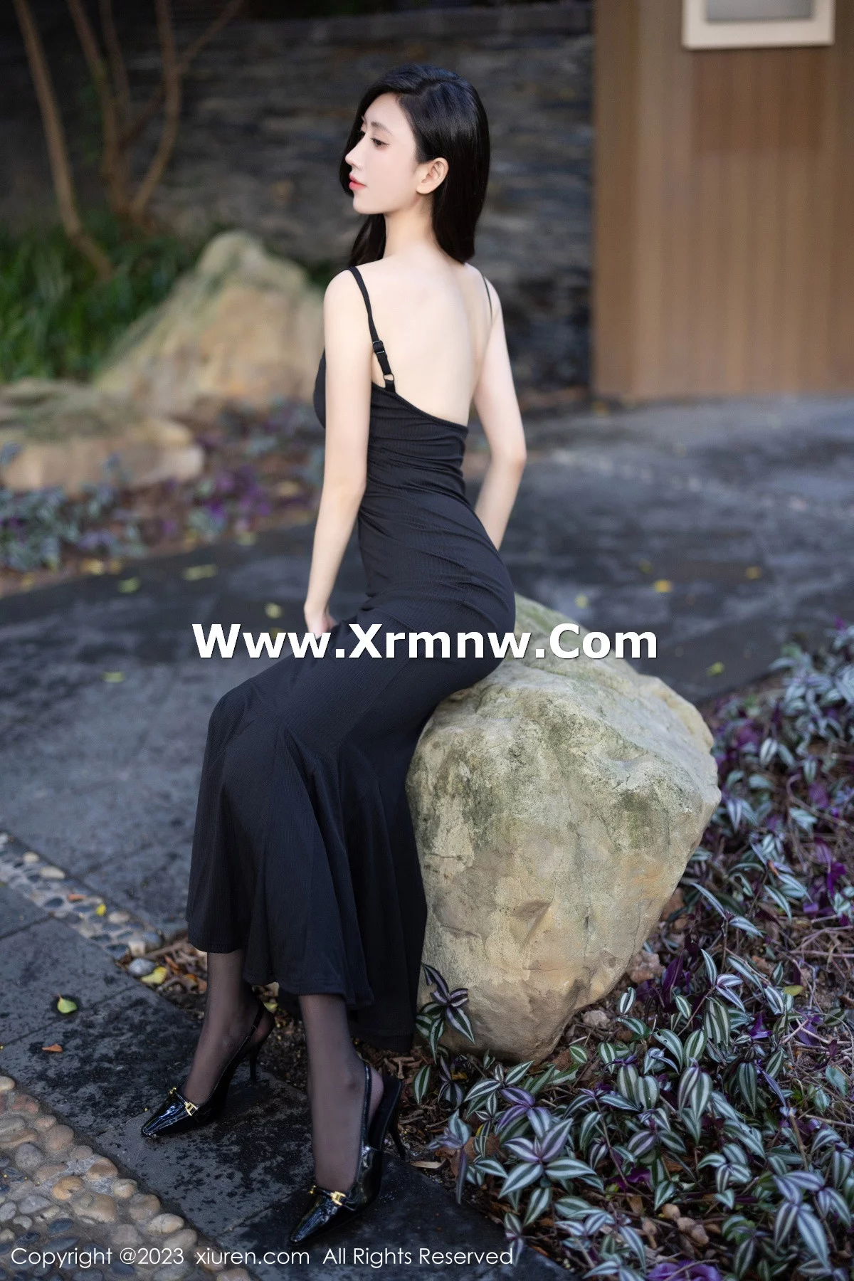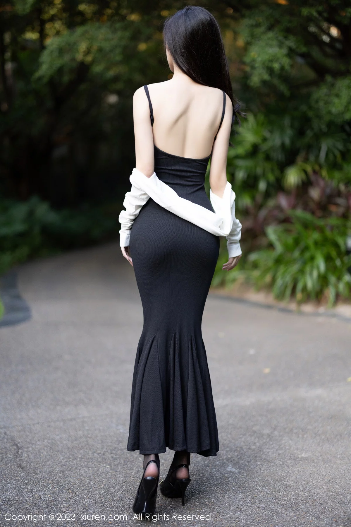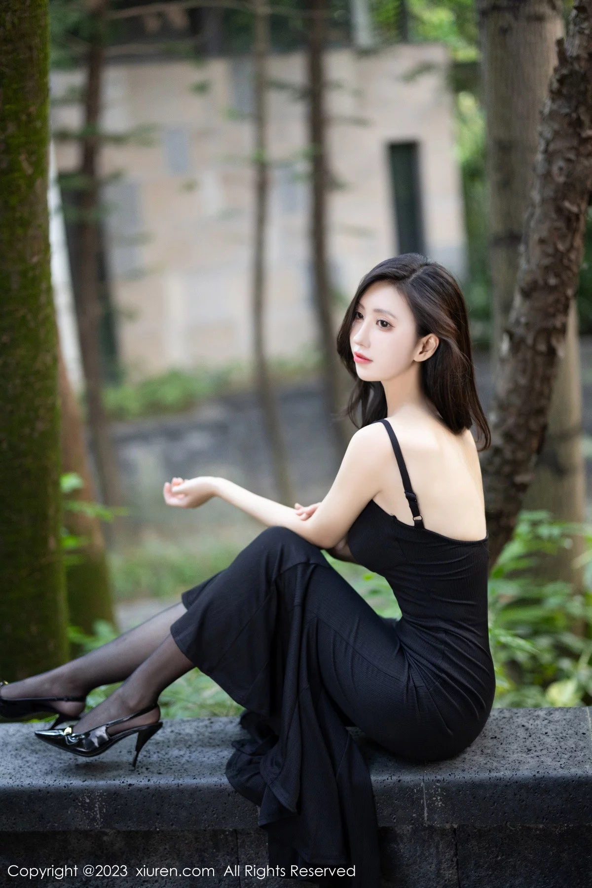 [XiuRen秀人网]No.7830 模特章芃芃户外场景性感黑色吊带长裙配魅惑黑丝秀美腿诱惑写真80P