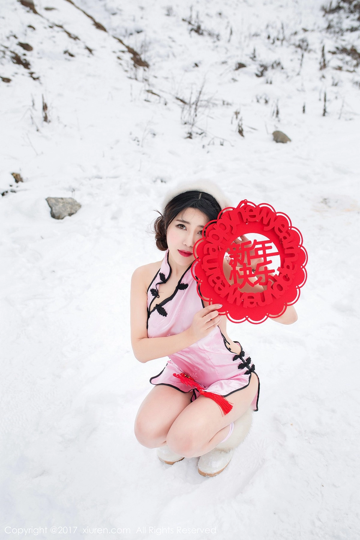 [XiuRen秀人网]No.686 嫩模兜豆靓Youlina雪地里粉红旗袍秀美乳翘臀新年福利诱惑写真50P