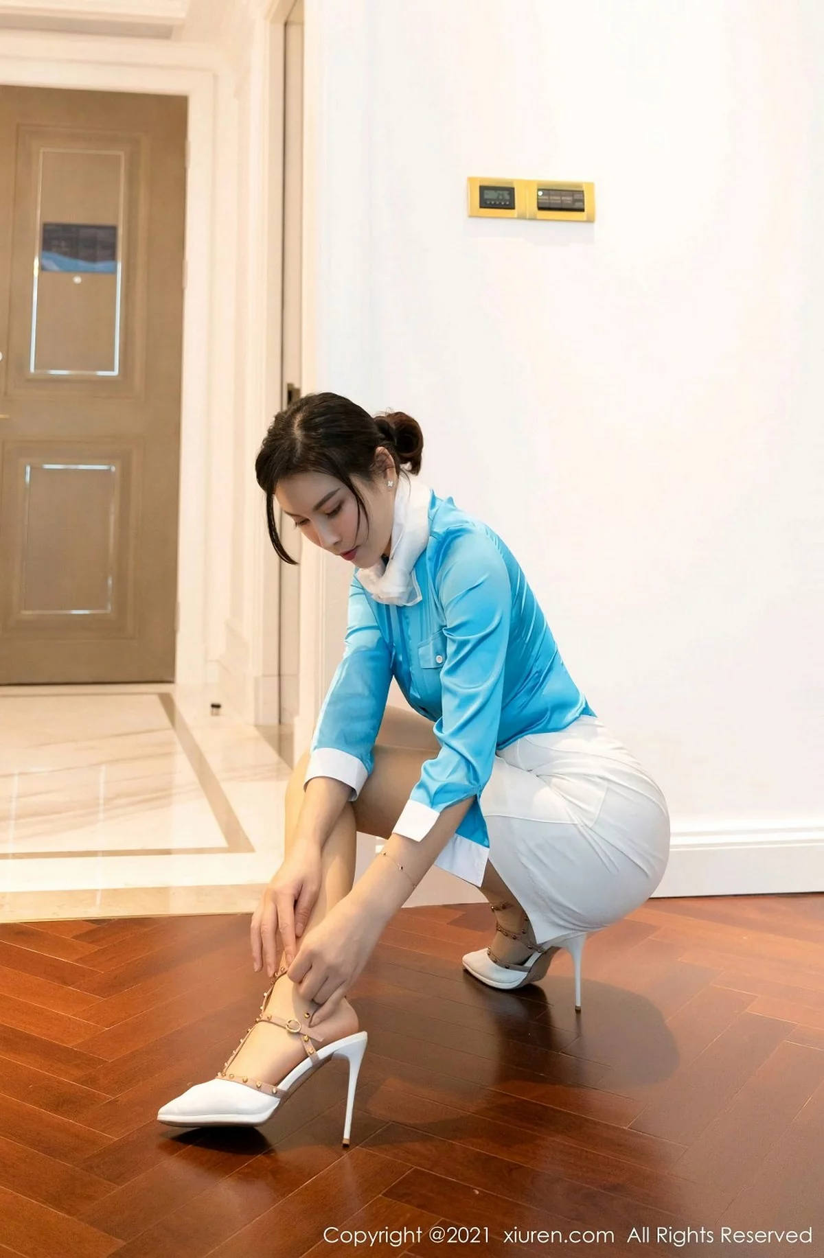 [XiuRen秀人网]No.3052 嫩模萌汉药baby心愿旅拍蓝色0L职业装半脱秀完美身材诱惑写真59P