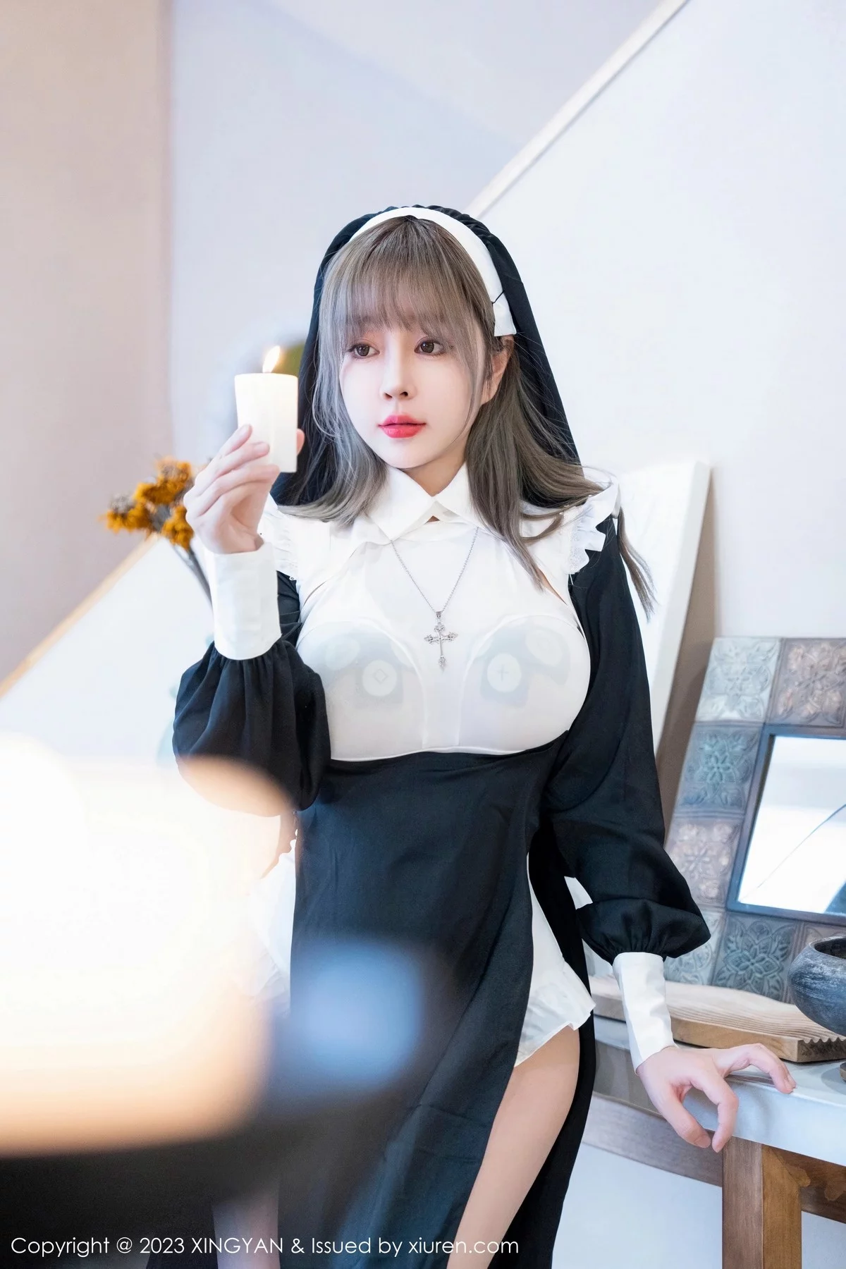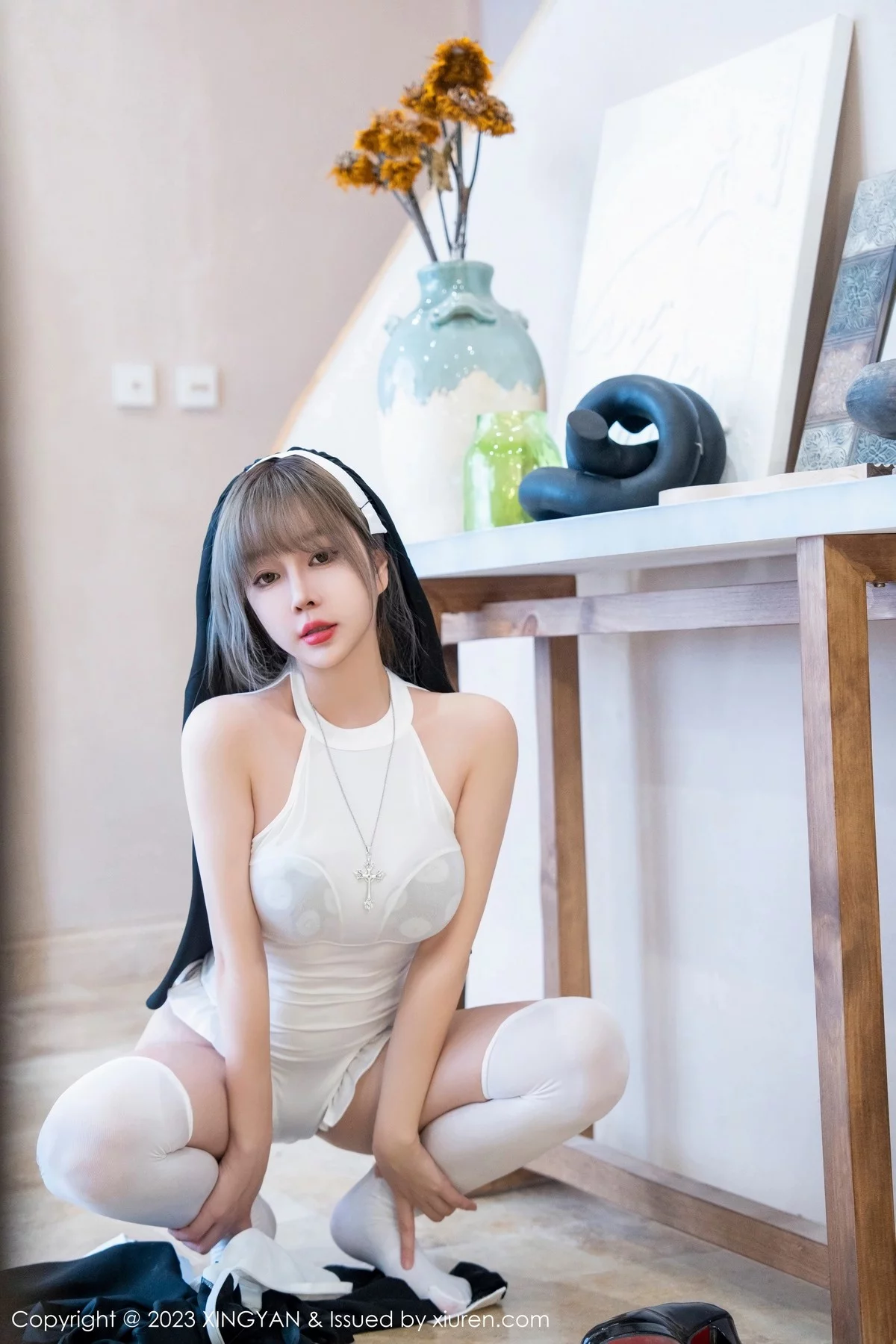 [XINGYAN星颜社]VOL.187 女神王雨纯半脱修女服饰露白色轻透上衣配白丝袜完美诱惑写真75P