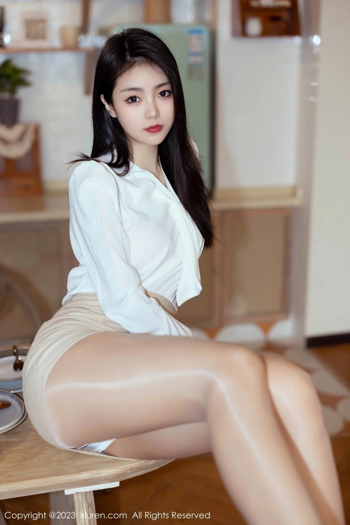 [XiuRen秀人网]No.6465 模特可乐Vicky性感白T配浅黄色短裙露闪亮肉丝秀美腿诱惑写真64P