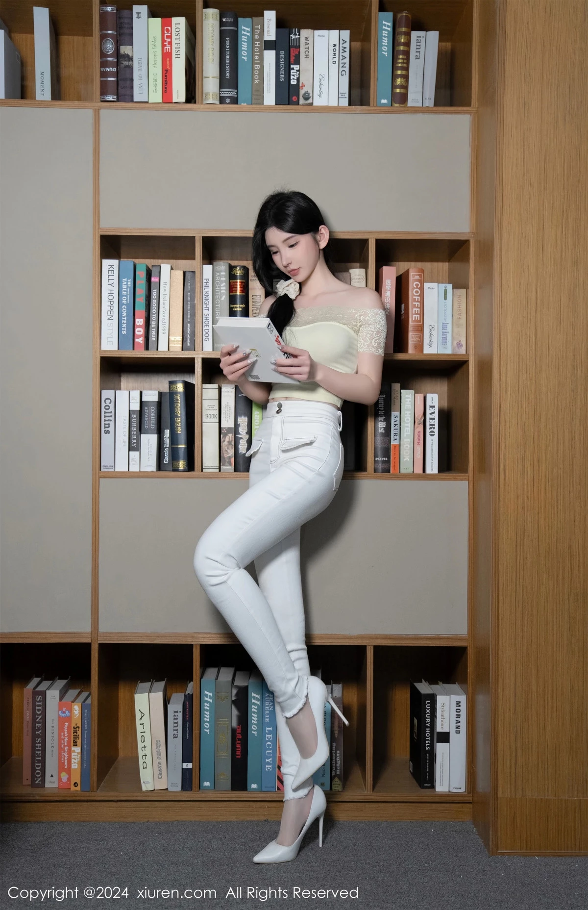 [XiuRen秀人网]No.8633 女神周于希Sally图书馆场景白色长裤露超薄肉丝秀美腿诱惑写真91P