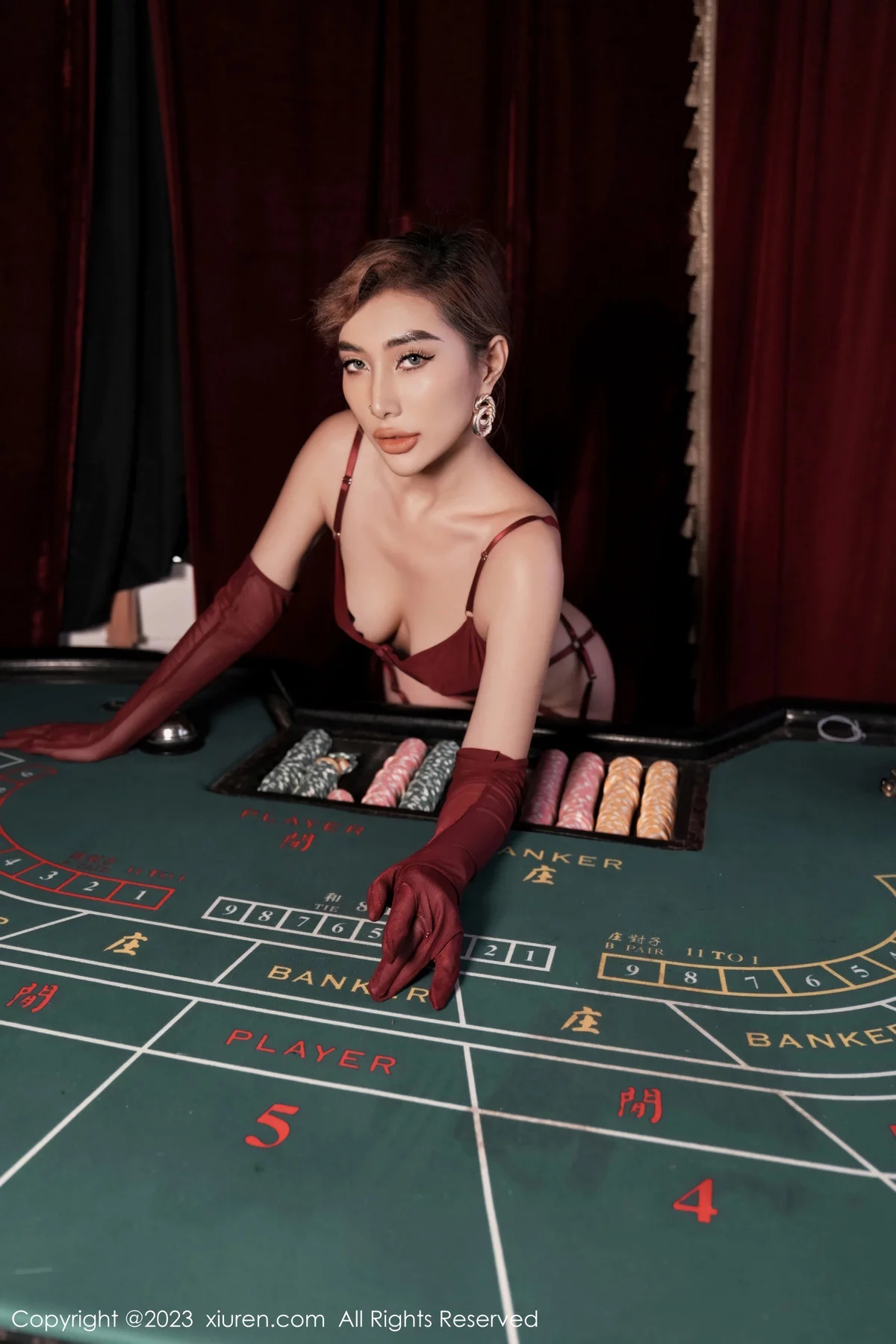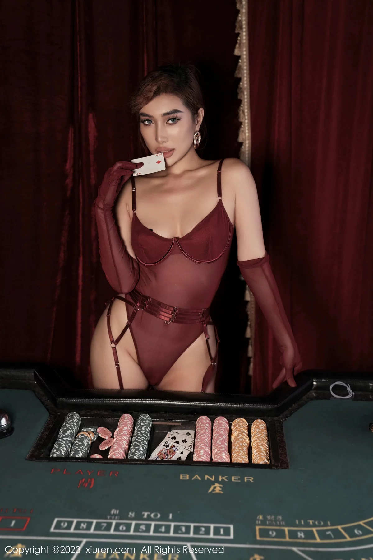 [XiuRen秀人网]No.7832 模特Mina米娜性感暗红色吊带短裙配黑丝袜秀完美身材诱惑写真83P