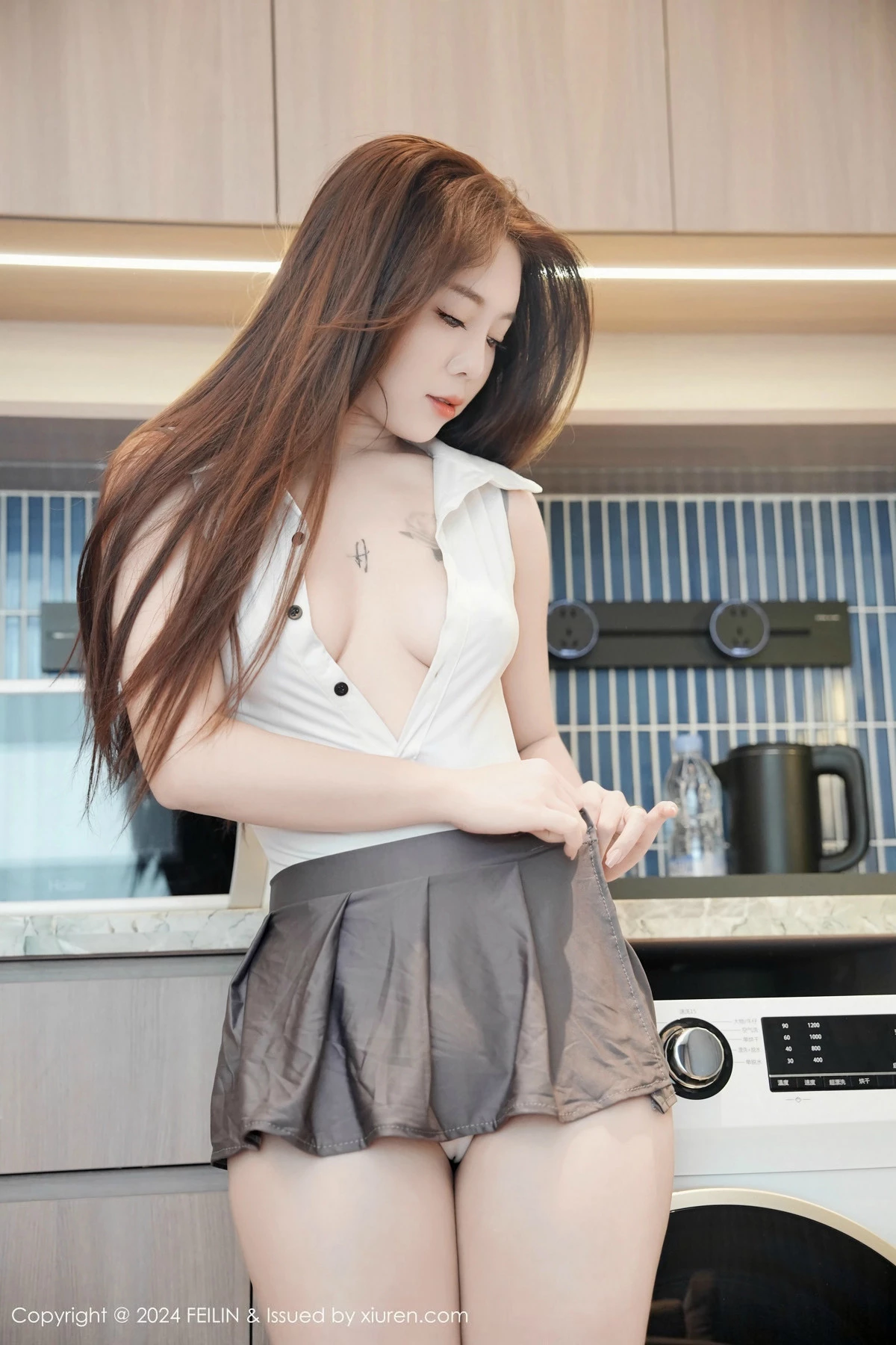 [FeiLin嗲囡囡]VOL.490 模特沐娜娜私房性感白色连体衣配灰色短裙秀翘臀美腿诱惑写真69P