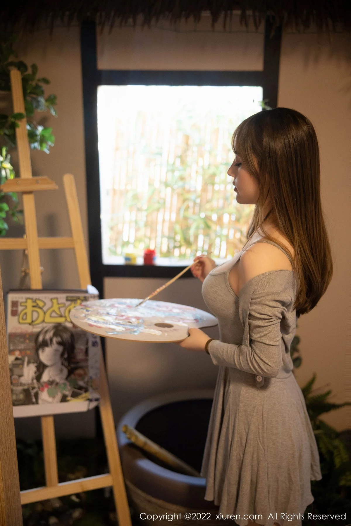 [XiuRen秀人网]No.5943 模特豆瓣酱绘画主题灰色低胸吊带裙配肉丝秀丰满身材诱惑写真71P