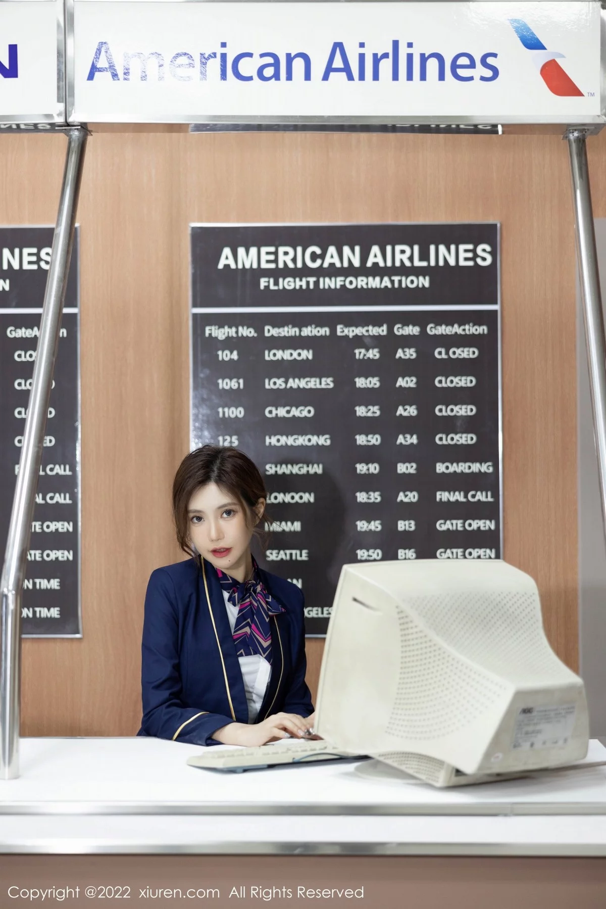 [XiuRen秀人网]No.5499 女神绮里嘉ula性感空姐制服半脱露蓝色内衣配开档灰丝诱惑写真60P