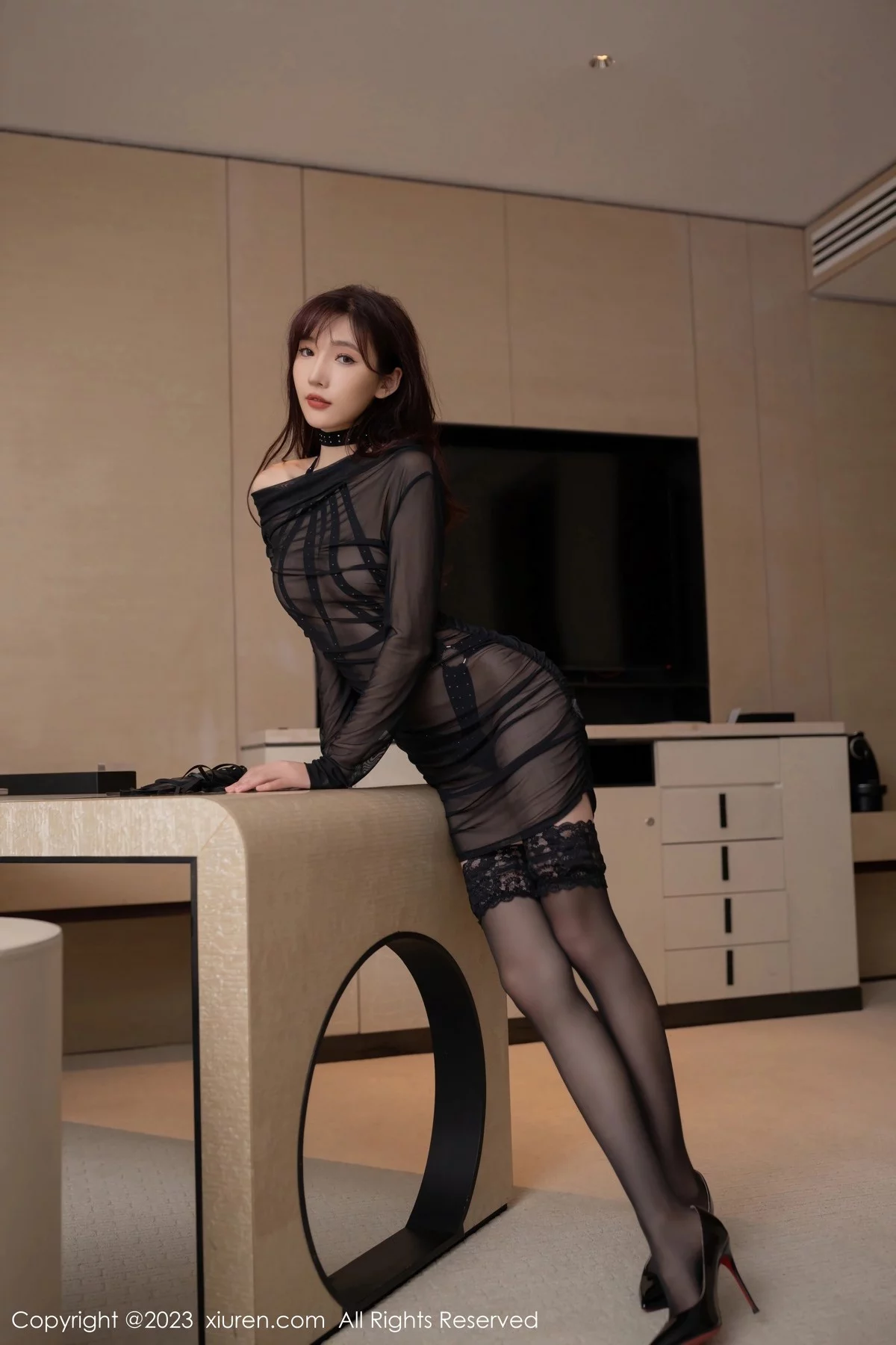 [XiuRen秀人网]No.6674 模特陆萱萱性感黑色轻透连衣服饰配黑丝袜秀曼妙身姿诱惑写真81P
